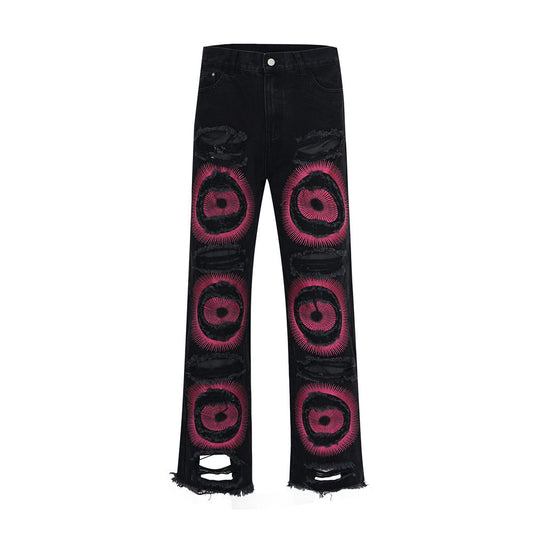 Men's Ripped Embroidered Denim Straight Leg Trousers